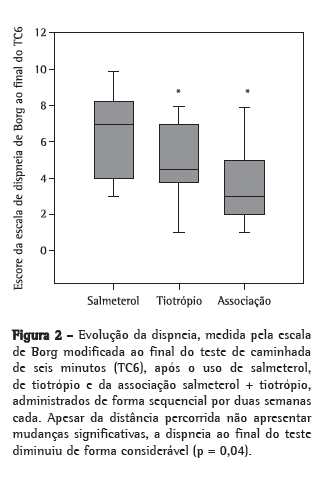 Embora os pacientes tenham referido menor dispneia após duas semanas de uso de tiotrópio em comparação ao período de monoterapia com salmeterol, essa diferença deve ser analisada com cautela. De acordo com o protocolo, aqueles que se encontravam clinicamente compensados com β2-agonistas de longa duração não foram incluídos. Não podemos, portanto, concluir pela eficácia superior de um broncodilatador em relação ao outro.