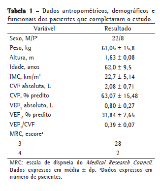 A Tabela 1 mostra os dados demográficos, antropométricos e funcionais dos 30 pacientes que completaram o estudo. A Tabela 2 resume os resultados do protocolo ao longo das quatro visitas.
