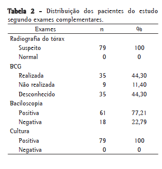 Em relação aos exames complementares, todos os pacientes apresentaram sorologia negativa para HIV, visto que esse era um critério de exclusão do estudo. Todos os pacientes tiveram resultados de suspeita de tuberculose na radiografia do tórax. Encontramos um grande número de pacientes que desconheciam seu estado vacinal sobre ao BCG (44,3%), e 9 (11,4%) não haviam recebido essa vacinação. Todos os pacientes realizaram exames laboratoriais de baciloscopia e cultura. A baciloscopia foi positiva em 61 pacientes (77,21%). Todos os pacientes apresentaram cultura de escarro positiva (Tabela 2).