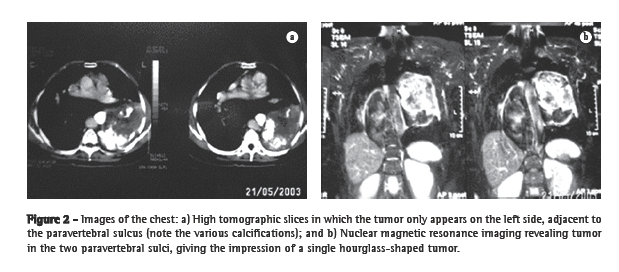 A 51-year-old Caucasian female homemaker, born in the city of Marília and a resident of the city of São Paulo (both located in the state of São Paulo), reported nonproductive cough, accompanied by pharyngeal and retrosternal pruritus, for three months. She also reported weight loss (2 kg) in the last two months. The patient described herself as a nonsmoker and reported no other lung diseases. The physical examination revealed that the patient, who was of average build, presented good general health status and normal hemodynamics. Pulmonary auscultation revealed bilateral breath sounds, which were reduced in the upper third of the left hemithorax, reduced vocal fremitus, underlying fluid density upon percussion, and reduced bronchophony, also in the upper third of the left hemithorax, without adventitious sounds. An anteroposterior X-ray (Figure 1a) revealed that, in two-thirds of the left hemithorax, there was opacity, which extended to the cardiac silhouette, suggesting that the tumor was located anterior to the ascending aorta. In a lateral X-ray (Figure 1b), the image was suggestive of a tumor in the paravertebral sulci, extending posteriorly to the heart. A tomography scan of the chest (Figure 2a) revealed a mass in the left paravertebral sulcus, extending to the right paravertebral sulcus, with central and peripheral calcifications. In order to plan the surgical procedure, we continued the investigation using magnetic resonance imaging (Figure 2b), which revealed a mass in the left paravertebral sulcus, extending to the right paravertebral sulcus, and maintaining cleavage planes with the adjacent structures. A transparietal puncture biopsy was carried out, and a diagnosis of liposarcoma was made. Resective surgery was then indicated. A left posterior lateral thoracotomy was performed in the fourth intercostal space. We dissected a tumor located posteriorly to the heart, anteriorly to the aorta, and to the right of the esophagus, with loose adhesions to the structures mentioned, and it was possible to remove the entire tumor through a left thoracotomy and through the opening in the mediastinal pleurae. Smaller tumors were dissected from the left paravertebral sulcus. Subsequently, chest tubes were inserted, and the incision was closed in layers. The drains were removed on postoperative day 3, and the patient was discharged on postoperative day 5. In the macroscopic and anatomopathological examination, the largest sample was seen to have an hourglass shape and found to weigh 994 g, with two lobes: one globular, 10 cm in diameter, firm, whitish, and fasciculated with gelatinous areas; and the other irregular in shape, measuring 14 × 9 × 8 cm, and yellowish upon dissection. An additional eight samples, irregular in shape and weighing 234 g altogether, were examined. Each was partially covered by a smooth and glossy membrane, with foci of hemorrhage, and, upon dissection, was yellow with whitish streaks and firm. In some cases, there was a bony consistency. Microscopy (Figure 3) revealed immature mesenchymal neoplasia characterized by the proliferation of anaplastic spindle cells with numerous atypical mitoses and bizarre multinucleated giant cells. The remaining samples consisted of proliferation of adipocytes, forming lobes amidst streaks of fibrosis and containing anaplastic cells with dense, strong chromatin staining. We concluded that it was a case of well-differentiated liposarcoma (lipoma-like) and dedifferentiated liposarcoma. The patient received adjuvant chemotherapy and underwent outpatient follow-up treatment for 3 years without recurrence.
