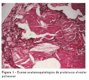 Sendo assim, optou-se pela realização de nova investigação clínica incluindo uma broncoscopia com biópsia transbrônquica, para se investigar uma possível infecção fúngica. O material obtido na broncoscopia revelou: escovado brônquico com pesquisa de fungos negativa, pesquisa de bacilo álcool-acidorresistente negativa e cultura negativa. O exame anatomopatológico confirmou PAP.