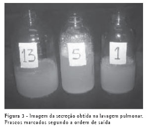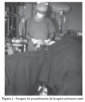 Três dos quatro pacientes (três mulheres) foram submetidos à lavagem pulmonar total, todas realizadas pelo mesmo cirurgião, em centro cirúrgico, segundo a técnica descrita por Ramirez-Rivera et al. em 1965,(14) sob anestesia geral e intubação com sonda de duplo lúme. Inicialmente isolam-se bem ambos os pulmões e mede-se a capacidade do pulmão a ser infundido. São feitas lavagens repetidas com soro fisiológico aquecido, com adição de 1,5 mL de heparina para cada frasco de soro e de N-acetilcisteína. A solução deve descer lentamente por gravidade para o pulmão a ser lavado. Ao atingir o volume medido, cessa-se a infusão do conteúdo e abre-se a outra via, que, por ação da gravidade combinada com a sifonagem, esvazia o pulmão correspondente (Figura 2).