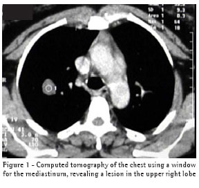 The results of the physical examination were normal, and the following complementary examinations were performed: chest X-ray; computed tomography of the chest; spirometry; intradermal reaction to purified protein derivative; Aspergillus serology test; fiberoptic bronchoscopy with bronchoalveolar lavage; and bronchial brush of the right segment. The chest X-ray revealed a nodule with well-defined borders in the upper third of the right hemithorax. The computed tomography of the chest (Figure 1) revealed a nodule with regular borders, measuring 2 cm, located in the apical segment of the upper right lobe. The nodule in reference presented contrast medium impregnation, with an increase of 26.7 Hounsfield units within three minutes after the injection of the venous contrast, and a central area of apparent cavitation. The analyses of the bronchoalveolar lavage and bronchial brush revealed negativity for neoplasm. The culture for acid-fast bacilli was also negative, as were the cultures for tuberculosis, fungi and bacteria.