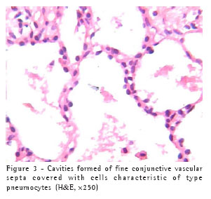 The definitive diagnosis of alveolar adenoma is made histologically. Macroscopically, the lesions are well-delineated, hemorrhagic and brownish/whitish in color, measuring less than 3 cm in diameter. They occur in isolation in any lobe or lung, although they are predominantly seen in the lower left lobe.(2) Microscopic examination reveals that the alveolar adenoma is characterized by multiple cystic cavities of varying sizes, containing proteinaceous eosinophilic material in the sections stained with hematoxylin and eosin. The cystic structures are covered with stratified squamous cuboidal epithelium consisting predominantly of cells with structural characteristics typical of type pneumocytes. The cystic cavities are delimitated by septa of varying thicknesses containing mesenchymal fibroblastic cells and leukocytes, similar to the findings of this study (Figures 2 and 3).(2-3)