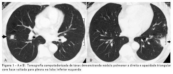 Um paciente, do sexo masculino, branco, de 67 anos, procedente de Blumenau (SC), representante de vendas, iniciou quadro de dispnéia, astenia, dor torácica e sudorese dez dias após limpeza do forro da sua casa, onde estão localizadas caixas d'água. Esteve em contato com fezes de morcego por tempo limitado, enquanto o local era varrido. A presença de nódulos pulmonares em radiografia e tomografia de tórax (Figuras 1A e 1B) e a ausência de expectoração justificaram a realização de biópsia de nódulopulmonar.