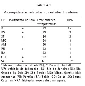 O isolamento do fungo do solo exige trabalho minucioso e várias amostras de diferentes locais, uma vez que o H. capsulatum se concentra em pequenos microfocos com condições de crescimento ideais, como temperatura entre 22 e 29ºC e umidade relativa de 67% a 87% ou mais, em certos períodos do ano.(3) A técnica de identificação do fungo é realizada por inoculação intraperitoneal em camundongo, o qual é sacrificado quatro semanas depois.(9) Neste trabalho foi possível isolar pela primeira vez o H. capsulatum em Santa Catarina, sendo esta uma evidência conclusiva de sítio epidêmico.(4) O único inquérito epidemiológico de Santa Catarina foi realizado em 1955, com 110 soldados em várias cidades com várias diluições de histoplasmina (1:10, 1:100, 1:1000) e apresentou 6,3% de positividade, não representando a realidade.(10) As microepidemias costumam ser mais freqüentes em áreas de maior endemicidade. São necessários novos estudos epidemiológicos para se determinar a prevalência da infecção neste Estado.
