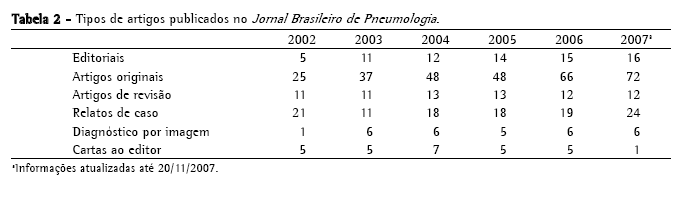 Os parâmetros listados nas Tabelas 1 e 2 correspondem a importantes medidas da qualidade geral de uma publicação. Pela sua observação, podemos constatar o enorme crescimento que o Jornal Brasileiro de Pneumologia vem tendo nos últimos anos.