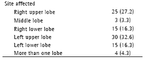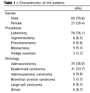 Of the 92 patients studied, 65 (70.6%) were male and 27 (29.4%) were female. The mean age was 63.2 years (median, 67 years). Table 1 shows that pulmonary lobectomy (76.1%) was the surgical procedure most commonly used, followed by pneumonectomy, conservative segmentectomy, bilobectomy, and wedge resection. The predominant histological type was adenocarcinoma (in 38% of the cases), followed by epidermoid carcinoma (in 33.7%). Most of the neoplasms were located in the left upper lobe in 32.6% of the patients and in the right upper lobe in 27.5% of the patients.