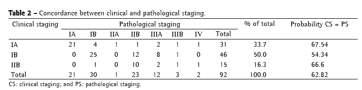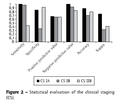 The data related to the patients were analyzed using Microsoft Office Excel 2003, and the statistical analysis was performed using the R for Windows software.(3) Sensitivity, specificity, positive predictive value, negative predictive value, and accuracy were calculated for CS IA (T1N0M0), CS IB (T2N0M0), and CS IIB (T3N0M0). None of the patients with CS IIB were found to present T2N1M0 preoperative staging. Cohen's kappa index was used to determine the power of concordance between CS and PS in the stages studied.(4)