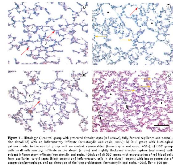 Results Histology In the control group, we observed preserved alveolar septa and fully-formed capillaries with normal-size alveoli, without inflammatory infiltrate (Figure 1a). In the O10' group, we observed a histological pattern very similar to that seen in the control group, without evident abnormalities (Figure 1b). However, in the O30' group, we observed some inflammatory cells in the alveoli and slightly thickened alveolar septum, with evident inflammatory infiltrate (Figure 1c). Despite these changes, the lung architecture did not change. In the O90' group, the extravasation of red blood cells from the capillaries, turgid septa, and a large quantity of inflammatory cells in the alveoli were evident (Figure 1d). The image suggests congestion and hemorrhage without impairment of the lung architecture.