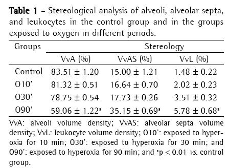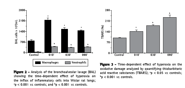 e os pulmões foram retirados para análise histológica e estereológica. Resultados: Observamos um aumento do número de macrófagos (2169,9 ± 118,0, 1560,5 ± 107,0 e 1467,6 ± 39,0) e neutrófilos (396,3 ± 35,4, 338,4 ± 17,3 e 388,7 ± 11,7), concomitante a um aumento do dano oxidativo (143,0 ± 7,8%, 180,4 ± 5,6% e 235,0 ± 13,7%) nos grupos O10', O30' e O90', respectivamente, quando comparados ao GC (781,3 ± 78,3%, 61,6 ± 4,2% e 100,6 ± 1,7%). Na análise histológica e estereológica foram observados alvéolos e septos normais no GC (83,51 ± 1,20% e 15 ± 1,21%), no grupo O10' (81,32 ± 0,51% e 16,64 ± 0,70%) e no grupo O30' (78,75 ± 0,54% e 17,73 ± 0,26%). Entretanto, no grupo O90' foi notado um influxo de células inflamatórias nos alvéolos e nos septos alveolares. Hemácias extravasaram do capilar para o alvéolo (59,06 ± 1,22%), com evidências de congestão, hemorragia e edema de septo (35,15 ± 0,69%). Conclusão: Os resultados indicam que a hiperóxia induziu uma ação lesiva no grupo O90' sobre o parênquima pulmonar, com repercussões de dano oxidativo e infiltrado inflamatório.