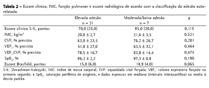 A Tabela 2 apresenta o escore clínico, o índice de massa corporal, a função pulmonar e o escore radiológico, de acordo com a classificação da adesão auto-relatada. Não foi identificada diferença estatisticamente significante entre os grupos para as variáveis estudadas (p > 0,05).