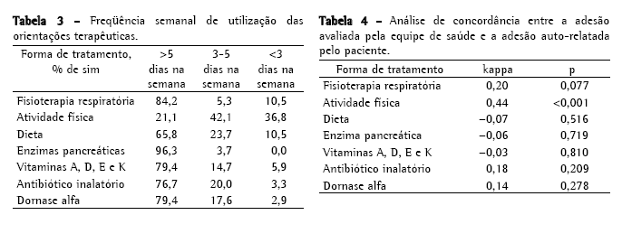 Outro estudo(15) analisou 91 pacientes com FC com idade de 14 a 40 anos. Os pacientes foram avaliados por questionário. Um escore de adesão foi calculado. Os profissionais da equipe de saúde também avaliaram a adesão. Oitenta e cinco por cento dos pacientes relataram boa adesão ao uso de enzimas pancreáticas nas grandes refeições, 84% ao uso dos suplementos vitamínicos, 65% ao uso dos antibióticos inalatórios, 50% aos suplementos dietéticos, 41% à realização da fisioterapia respiratória e 38% ao uso de enzimas pancreáticas nos lanches. Não foi observada correlação entre a adesão e as características sócio-demográficas dos pacientes ou o seu conhecimento sobre a doença. As correlações entre o escore de adesão do paciente e o dos profissionais de saúde foram fracas. Em comparação, esse estudo avaliou pacientes com uma faixa etária semelhante à de nosso trabalho, mas encontrou uma adesão menor à fisioterapia respiratória. A relação entre o escore de adesão auto-relatada pelo paciente e avaliada pelos profissionais de saúde foi fraca, à semelhança de nosso estudo.