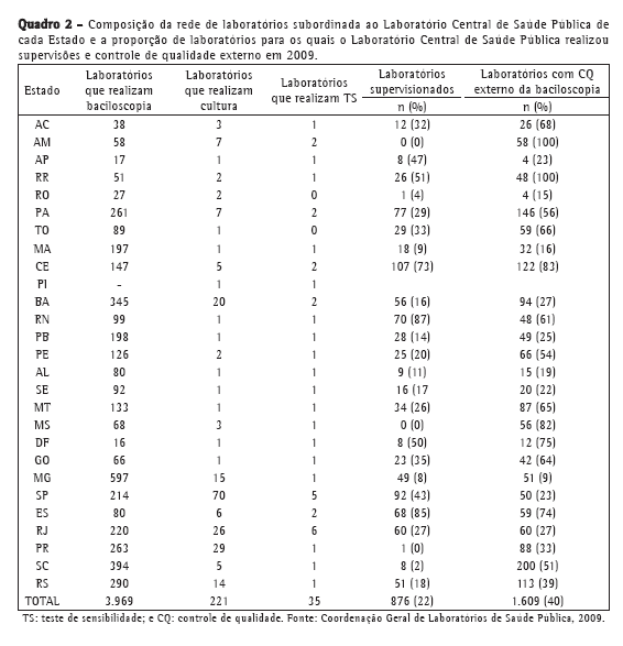 Quanto aos LACENs, apenas 8 julgam ter 20 ou mais pontos fortes entre os 25 critérios usados na autoavaliação. Os mais frequentemente apontados são baciloscopia descentralizada, utilização de procedimentos operacionais padrão, laboratório informatizado, equipe de profissionais organizada, boa organização do serviço, controle de qualidade (CQ) de reagentes e meios, profissionais qualificados, dimensão adequada e boas práticas de baciloscopia. O ponto fraco universalmente identificado é a precariedade do CQ da rede periférica. Tanto a releitura de lâmina como as visitas técnicas são insuficientes em praticamente todos os Estados, com uma média de cobertura de 22% (Quadro 1). Os LACENs com pior desempenho nesse quesito são aqueles com um maior número de laboratórios em sua rede, o que significa que as zonas metropolitanas mais populosas recebem menor cobertura de CQ. Essa dificuldade se deve, por um lado, à carga de trabalho excessiva, já que não há uma equipe própria para realizar essa atividade e, por outro, à escassez de recursos para transporte e diárias. Preocupa particularmente essa fragilidade, uma vez que qualquer outro teste que venha a substituir ou complementar a baciloscopia também necessitará de CQ.