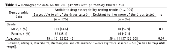 The study included 211 patient medical records, 2 of which were excluded because they were incomplete. Therefore, 209 medical records of patients with pulmonary tuberculosis were considered eligible for data analysis. Of those patients, 34 (16%) showed primary resistance to at least one of the five drugs tested in the first sputum sample. Table 1 shows the gender and age of the 209 patients with pulmonary tuberculosis by patient group stratified by drug susceptibility testing result. There were no significant differences regarding these variables.