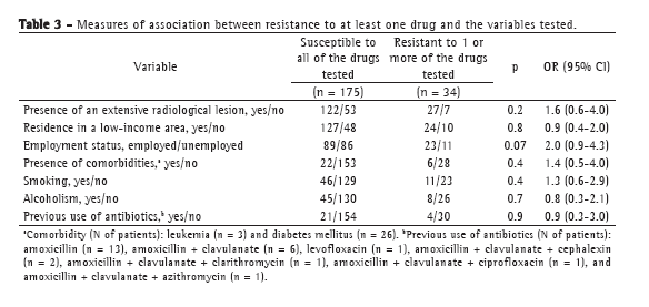 In our study, we identified no association between the variable "cavitation on baseline chest X-ray" and the rate of drug resistance. However, a study conducted at a referral center for infectious diseases in the state of Minas Gerais, Brazil, between September of 2000 and January of 2004, found that the risk of multidrug resistance was higher in patients with cavitation of more than 4 cm in diameter and in those who had received previous tuberculosis treatment.(17)