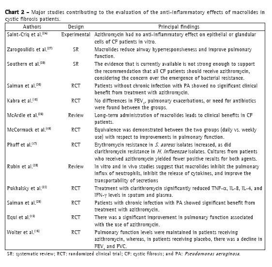 Various studies have shown positive results regarding the reduction in the number of exacerbations and regarding stabilization of or increase in respiratory capacity, whereas others have failed to demonstrate these effects (Chart 2). Treatment with azithromycin can have beneficial effects in cystic fibrosis, although the optimal dosage and duration of administration have yet to be well defined.(28) Two studies seem to synthesize the recommendations of and the controversies over the use of azithromycin in cystic fibrosis: while one study demonstrated significant benefits of treatment with azithromycin in children colonized with P. aeruginosa, another study undertaken by the same group of authors found no benefits of treatment with azithromycin in patients uninfected with P. aeruginosa.(29,30) In addition, it is essential to bear in mind the possibility that resistance to macrolides and other antibiotics will increase, as well as the clinical impact of colonization with more resistant pathogens.(18-20)