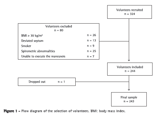 The sample was composed of individuals from the cities of Natal (in the state of Rio Grande do Norte), Recife (in the state of Pernambuco) and Piracicaba (in the state of São Paulo). The inclusion criteria were being healthy, being a non-athlete, being between 20 and 80 years of age,(6) having a BMI between 18.5 and 29.9 kg/m2, and being a non-smoker.(8) Subjects with a history of respiratory disease (asthma, chronic bronchitis, tuberculosis, COPD, or emphysema) were excluded, as were those with a history of neuromuscular disease, cerebrovascular, or cardiac disease (myocardial infarction or heart failure)(8,13,14); those with rhinitis, sinusitis, or deviated septum; those having previously undergone nasal surgery; those having had a cold or the flu in the last week(11); those regularly using medication to treat respiratory allergies; those taking oral corticosteroids, central nervous system depressants, barbiturates, or muscle relaxants(14,15); those who were pregnant(9); those with an FVC  80% of the predicted value; and those with an FEV1/FVC ratio  85% of the predicted value.(6) Individuals incapable of understanding or performing the maneuvers required for assessment were also excluded from the study. None of the participants had previously been exposed to respiratory muscle strength measuring techniques. The study was approved by the Research Ethics Committee of the Onofre Lopes University Hospital (Protocol no. 260/08), and all subjects gave written informed consent. All procedures were conducted in accordance with the ethical standards set forth in the Declaration of Helsinki.(16)