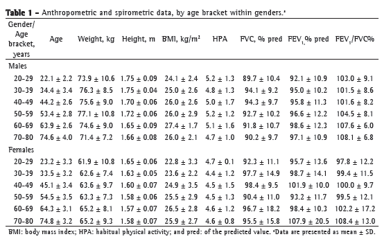 Spirometry was conducted with a DATOSPIR-120C® spirometer (Sibelmed, Barcelona, Spain), properly calibrated, and all spirometric tests were conducted in accordance with American Thoracic Society/European Respiratory Society (ATS/ERS) guidelines.(17) We determined FVC, FEV1 and the FEV1/FVC ratio. Results (obtained in absolute and relative values) were compared with previously published reference values.(18)