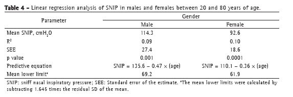 Several studies have mentioned the importance of SNIP as a valid, non-invasive, easy-to-apply test of inspiratory muscle strength, as well as a complement to MIP.(5,6) This is the third study in the literature to propose reference values for SNIP in healthy adults and the first to do so for the Brazilian population. The results of the present study show that SNIP was significantly lower in females than in males, a finding that is likely due to the greater muscle mass of the latter, corroborating the findings of other studies investigating respiratory muscle strength.(11,21,22) In terms of SNIP values, we found significant differences between age brackets (within each gender) and a decrease with age. This might be attributed to the reduction in inspiratory muscle strength during the aging process, resulting from sarcopenia; the loss of muscle mass(22-24); and the loss of viscoelasticity of the lungs and rib cage,(23) associated with an increase in abdominal fat, which can interfere with the biomechanics of the diaphragm.(11) Among the independent variables (age, weight, height, BMI, and HPA), only age correlated with SNIP (a weak negative correlation), which is in agreement with the findings of Uldry  Fitting(6) and, for males only, of Kamide et al.(9) Uldry  Fitting(6) also found that weight and BMI did not correlate with SNIP. Although respiratory muscle strength is directly related to the level of physical activity,(11) HPA showed no correlation with SNIP in either males or females. It should be borne in mind that Baecke's questionnaire provides only an index, which precludes characterizing the level of physical activity, thereby making it difficult to identify sedentary lifestyles.(25) The SNIP reference values obtained in the present study differed from those reported for healthy Japanese males and females (76.8 ± 28.9 cmH2O and 60 ± 20 cmH2O, respectively). Our linear regression analysis demonstrated that predictive equations resulted from SNIP as a function of age, for both genders, which is in keeping with the findings of Uldry  Fitting(6) and Kamide et al.,(9) except that the latter group of authors found that, in females, SNIP correlated only with BMI. This is in contrast with the reported negative influence of age on respiratory muscle strength,(21-23) as well as with the positive relationship between respiratory muscle mass and lean mass, which is more evident in males.(11,21) One important aspect of our results is that the coefficient of determination for age in the linear regression model was low, for males and females (R2 = 0.09 and R2 = 0.1, respectively), although that finding is also analogous to those of Uldry  Fitting (R2 = 0.09 and R2 = 0.05, respectively) and of Kamide et al. (R2 = 0.14 for males).(6,9) According to the ATS,(21) the wide variability in reference values is due to methodological differences that can influence the assessment of lung function, including the measurement technique, as well as individual, biological, and population aspects. In this context, we should highlight a number of differences between the present study and those conducted by Uldry  Fitting(6) and Kamide et al.(9) Our investigation adhered to the recommendations of the ATS(21) and was based on methodologies of earlier studies designed to obtain reference equations for lung function(14,18) and muscle function.(6,11,19) Another factor to consider is that there can be ethnic and individual differences within a given population. In comparison with the populations of European countries and of Japan, the Brazilian population is ethnically heterogeneous. Reference values should be based on recent data, and the most recent predictive equations for SNIP were published in 1995 and 2009.(6,9) Sociodemographic and environmental changes likely influence the results, which should therefore be updated periodically. As such, the differences observed might be attributed to differences in technical assessment, equipment, and population characteristics.