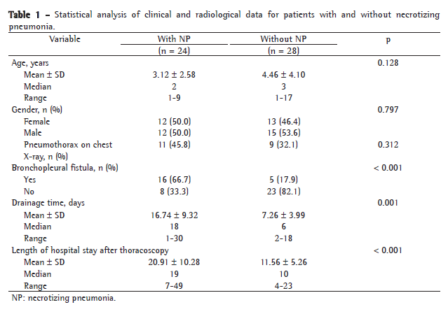 One group of authors(13) evaluated 107 adult patients submitted to video-assisted thoracoscopy due to empyema and identified NP in 3 (2.8%). In another study,(14) involving 39 children who did not respond to drainage alone and presented loculations on chest CT scans, 2 (5.1%) were found to have NP. In yet another study,(15) the incidence of NP was reported to be 12.5% in a group of 16 children. In our study, NP was diagnosed in 46% of the cases. We believe that this high incidence is related to the fact that our hospital is a referral hospital for pediatric thoracic surgery and receives patients who do not respond to the conventional therapy-drainage and antibiotic therapy.