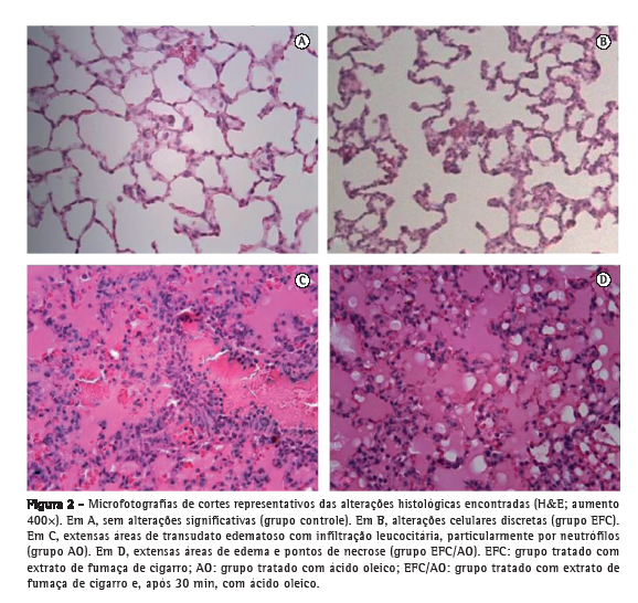 No presente estudo, foram investigados os efeitos agudos da administração i.v. de EFC como agente agressor pulmonar sobre parâmetros fisiológicos, morfológicos e relacionados à inflamação. Uma vez que a queima dos cigarros libera mais de 4.000 agentes químicos(18) e o EFC é rico em produtos oxidantes, um modelo animal dessa natureza poderia vir a se tornar um novo, rápido e prático instrumento de investigação original dos mecanismos de agressão pulmonar relacionados ao uso do tabaco. Com a finalidade de obter-se uma ideia da intensidade das alterações agudas desencadeadas pelo uso de EFC i.v., o novo modelo foi comparado com o tradicional método de estudo de LPA provocada por AO. Além disso, também foi investigado o possível efeito potencializador do uso prévio de EFC no modelo de LPA por AO.
