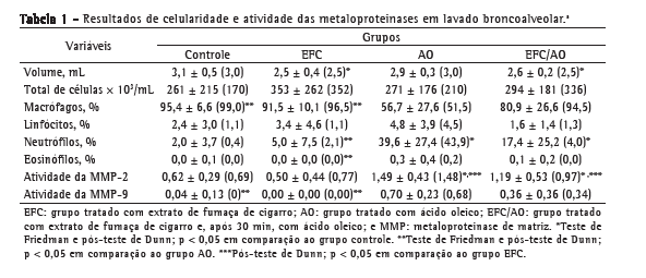Os volumes de LBA recuperados dos grupos EFC e EFC/AO foram significantemente inferiores aos do grupo controle (Tabela 1). No tocante ao diferencial de células, o grupo AO mostrou uma proporção significantemente menor de macrófagos em comparação aos grupos controle e EFC. Os grupos AO e EFC/AO mostraram proporções mais elevadas de neutrófilos do que o grupo controle, enquanto o grupo AO também exibiu elevação significante de neutrófilos em relação ao grupo EFC. A atividade gelatinolítica da MMP-2 mostrou-se significantemente mais elevada nos grupos AO e EFC/AO em comparação aos grupos controle e EFC. Já no tocante à atividade da MMP-9, o grupo AO exibiu um valor superior aos dos grupos controle e EFC.