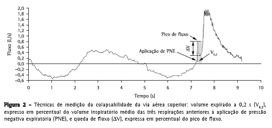 A aplicação de PNE durante o inicio da expiração produz um imediato pico de fluxo, seguido de uma queda repentina de grau variado. A colapsabilidade da via aérea superior é avaliada medindo-se a limitação ao fluxo como fluxo, expressa em percentual do pico de fluxo imediatamente após a aplicação de PNE. O fluxo mínimo é identificado nos primeiros 200 ms de aplicação da PNE para evitar reações reflexas e voluntárias ao estímulo da PNE.(16) Os valores de ∆%fluxo são calculados considerando-se a maior de sete medições. A colapsabilidade da via aérea superior também é avaliada medindo-se o volume expirado a 0,2 s (V0,2) imediatamente após a aplicação de PNE (Figura 2). Esses valores são expressos em percentual do volume inspiratório médio das três respirações anteriores à aplicação de PNE. Os volumes medidos são aceitos apenas quando as diferenças entre inspiração e expiração para cada uma das três respirações anteriores são menores que 10%. Os valores de V0,2 são calculados como a média de sete medições.