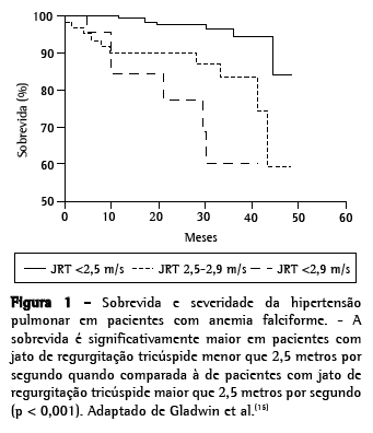 A hipertensão pulmonar, um distúrbio caracterizado por elevações da pressão arterial pulmonar e da resistência vascular pulmonar, vem sendo reconhecida, com maior freqüência, em pacientes com anemia falciforme.(7-12) Por exemplo, a prevalência de hipertensão pulmonar diagnosticada por ecocardiografia em pacientes avaliados em centros de referência varia de 20 a 30%.(7,11) Em estudos de autópsia, aproximadamente 75% dos pacientes com anemia falciforme apresentam evidência histológica de hipertensão pulmonar.(13) Além disso, vários estudos retrospectivos demonstram que pacientes com hipertensão pulmonar associada à anemia falciforme têm um prognóstico pior. Um estudo demonstrou uma taxa de mortalidade de 40% em 22 meses de seguimento com um odds ratio de 7,86 (2,63-23,4).(11) No estudo de outros autores, a sobrevida média para pacientes com anemia falciforme complicada por doença pulmonar crônica e hipertensão pulmonar foi de 2,5 anos.(4) De forma semelhante, um outro trabalho(14) demonstrou uma mortalidade de 50% em dois anos em pacientes com hipertensão pulmonar comprovada por cateterismo cardíaco direito.