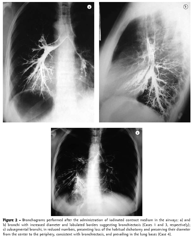 Despite being universally accepted as the best method for the diagnosis and surgical evaluation of bronchiectasis, bronchogram, initially described by Sicard and Forestier in 1922, has lately been less often employed. This is due to several factors: allergic reactions to the contrast medium; bronchospasm (the procedure causes extreme discomfort to the patient); the test is performed on one lung at a time (the study of the other lung can only be performed after a two- to four-week interval); and difficulty of interpretation by less experienced radiologists. However, the most important factor was the advent, in the 1980s, of computed tomography, which is currently the method of choice for the study of bronchiectasis(19,20) (Figures 3a, 3b, and 3c).