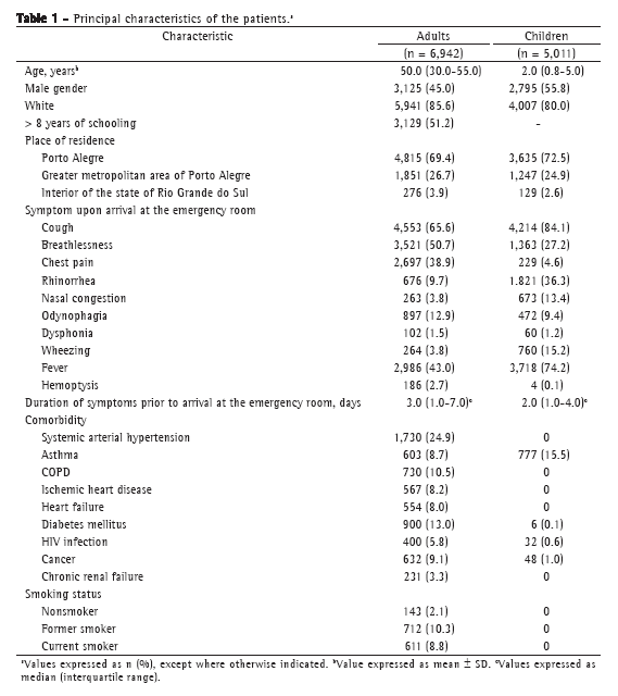 Respiratory complaints are the motive for a large proportion of outpatient visits, emergency room visits, and hospitalizations.(5) A study conducted in a developing country(6) showed that 10% of all emergency room visits were due to respiratory diseases. In a two-year study conducted in the city of Gama, Brazil,(7) 641,905 emergency room visits were evaluated, 37,642 (5.8%) of which were found to be due to respiratory complaints. Studies on the pattern of emergency room visits by individuals with respiratory symptoms are important, because they could inform decisions regarding the organization and planning of health services in order to meet this demand.(6,7) The objective of the present study was to evaluate the prevalence of respiratory symptoms as the motive for emergency room visits by adult and pediatric patients at a tertiary care hospital, describing the major clinical syndromes diagnosed and the patient outcomes.