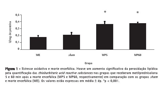 Os resultados do presente estudo mostram que a administração precoce de metilprednisolona após a morte encefálica aguda não melhora os índices de oxigenação ou os parâmetros hemodinâmicos em pulmões ventilados durante 120 min. Demonstramos também um aumento na geração de produtos da peroxidação lipídica nos grupos tratados com metilprednisolona após 5 e 60 min de morte encefálica. Como demonstrado previamente, o traumatismo cranioencefálico aumenta significativamente os níveis de peroxidação lipídica no tecido pulmonar somente 24 h após o trauma,(22) o que poderia explicar os resultados de peroxidação lipídica obtidos no presente estudo. Entretanto, as causas exatas desses achados não podem ser determinadas a partir de nossos experimentos.