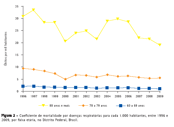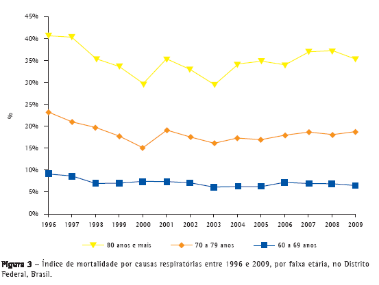 Objetivo: Comparar os índices de mortalidade por doenças respiratórias em idosos residentes no Distrito Federal (DF) antes e após a implantação da campanha nacional de vacinação contra influenza. Métodos: Estudo ecológico de séries temporais. Os dados referentes à população do DF acima de 60 anos entre 1996 e 2009 foram obtidos de bancos de dados oficiais. As variáveis estudadas foram o coeficiente de mortalidade geral (CMG), coeficiente de mortalidade por doenças respiratórias (CMDR) e índice de mortalidade por causas respiratórias (IMR). Foi realizada uma análise qualitativa dos dados referentes ao período antes e após a implantação da campanha de vacinação (1996-1999 e 2000-2009, respectivamente). Resultados: O CMG aumentou com o incremento da faixa etária. No decorrer do período do estudo, houve uma redução no CMG em todas as faixas etárias, especialmente naquela com 80 anos ou mais. Houve redução do CMDR em todos os grupos etários, especialmente naqueles com mais de 80 anos. O IMR mostrou uma redução em todas as faixas etárias por todo o período estudado. Em 2000, ano imediatamente subsequente à primeira campanha vacinal, a redução do IMR foi mais pronunciada na faixa etária ≥ 70 anos; em 2001, houve um aumento do IMR em todas as faixas etárias, apesar da maior adesão à campanha de vacinação em relação a 2000. Conclusões: A vacinação contra a influenza parece influir positivamente na prevenção da mortalidade por doenças respiratórias, particularmente nos idosos com 70 anos ou mais