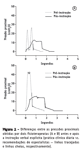 A instrução verbal sobre como realizar a HM melhorou o desempenho dos fisioterapeutas no sentido de que a manobras pós-instrução geraram PFI mais baixos e TIs mais longos. Entretanto, essas diferenças pouco fizeram para melhorar a eficiência da técnica, pois os PFE ainda eram muito baixos. Isso é provavelmente explicado pelo fato de que a Palv ainda era muito baixa no início da expiração, o que resultou em uma pressão de condução baixa para fluxo expiratório. Outros autores relataram grande variabilidade na implantação prática da manobra de HM,(4,5,13-15,26) cuja execução raramente segue a descrição original. Isso faz com que seja praticamente impossível comparar a efetividade da HM entre estudos clínicos.(27)