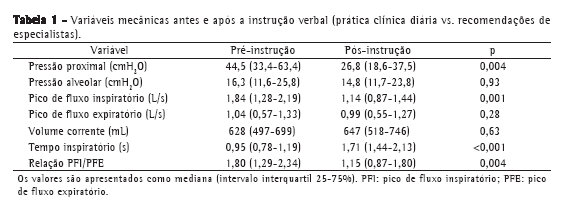 Os dados são apresentados como mediana e intervalo interquartil (IQ) 25-75%. Para cada variável, ANOVA para medidas repetidas foi utilizada para avaliar os seguintes fatores intra-sujeitos: os três cenários clínicos e as duas fases (antes e após as instruções). Todas as interações de duas vias entre esses fatores também foram testadas. Fluxo inspiratório versus fluxo expiratório e pressão alveolar versus pressão proximal também foram testados como fatores intra-sujeitos para comparar variáveis de pico de fluxo e de pico de pressão, respectivamente. Valores de p < 0,05 foram considerados estatisticamente significativos.
