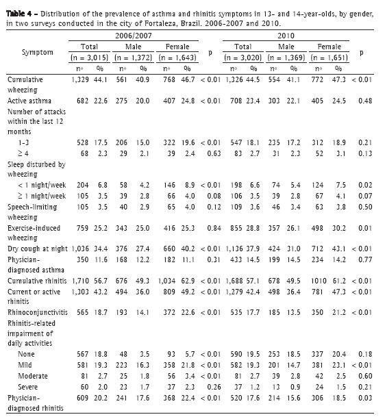 In conclusion, the results of our second survey, conducted in 2010, confirm the high prevalences of asthma, rhinitis, and symptoms previously observed in this age group, revealing an increase in the frequency of exercise-induced wheezing and dry cough at night. Underdiagnosis of asthma and rhinitis remains evident, although there was an increase in the frequency of physician-diagnosed asthma and a reduction in the frequency of severe rhinitis. In addition, the present study confirms the predominance of females and private school students among the adolescents reporting symptoms of these diseases. Finally, the present study shows, for the first time, a comparison of the prevalences of asthma and rhinitis between two different periods in the city of Fortaleza, reporting current and relevant data that serve to alert health administrators and planners of the essential need to invest in the quality of primary care focused on the prevention and control of these diseases.