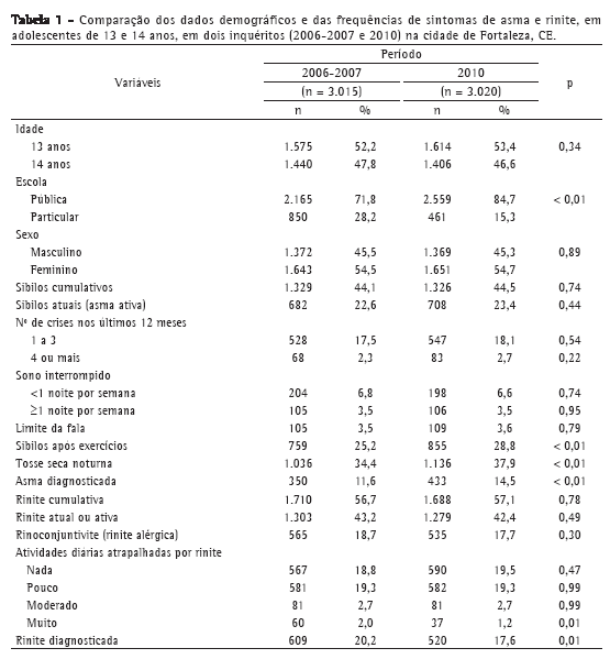 Comparação temporal das prevalências de asma e rinite em adolescentes em Fortaleza, Brasil