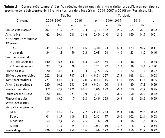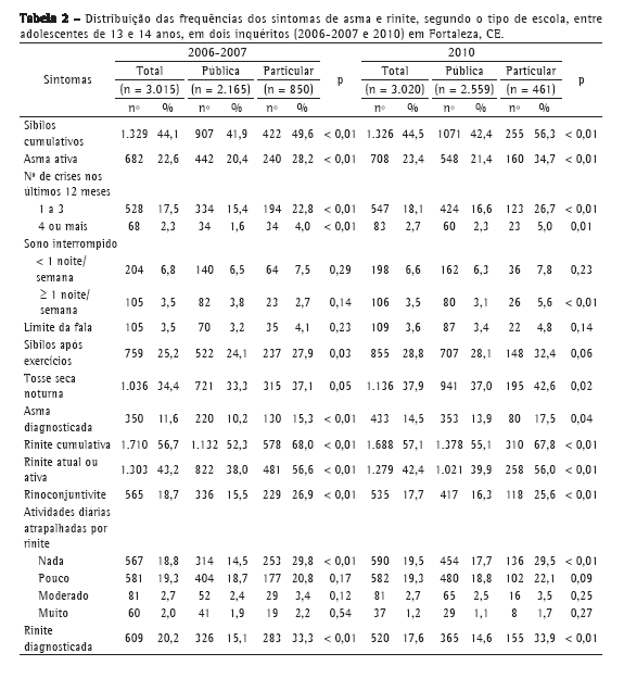 Na Tabela 2, observa-se que, em ambos os inquéritos, a maioria dos sintomas foram mais prevalentes entre os adolescentes das escolas particulares. Destacamos as variáveis cujas diferenças entre os tipos de escola (pública e particular) foram estatisticamente significativas em 2006-2007 e que continuaram em 2010, a saber: sibilos cumulativos, asma ativa, uma a três crises de sibilos nos últimos 12 meses, quatro ou mais crises de sibilos nos últimos 12 meses, tosse seca noturna, asma diagnosticada, rinite cumulativa, rinite atual, rinoconjuntivite, atividades diárias nada atrapalhadas por rinite e rinite diagnosticada. Quanto à variável sibilos após exercícios, foi observado um predomínio entre os adolescentes de escolas particulares em 2006-2007 com significância estatística (p = 0,03) e, em 2010, com tendência à significância estatística (p = 0,06). Quanto à questão "sono interrompido uma ou mais noites por semana", houve predomínio entre os adolescentes de escolas particulares apenas em 2010 (p < 0,01).