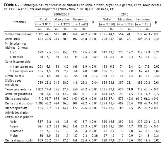 Nos dois inquéritos, nota-se uma predominância de vários sintomas de asma e rinite no gênero feminino (Tabela 4). Podemos destacar as seguintes variáveis, cujas diferenças entre os sexos foram estatisticamente significativas nos dois inquéritos: sibilos cumulativos, sono interrompido menos de uma noite por semana, tosse seca noturna, rinite cumulativa, rinite atual, rinoconjuntivite, atividades diárias pouco atrapalhadas por rinite e rinite diagnosticada. Quanto às variáveis asma ativa, uma a três crises de sibilos nos últimos 12 meses e atividades diárias nada ou moderadamente atrapalhadas por rinite (p < 0,01 para todas), foi observado um predomínio no gênero feminino apenas em 2006-2007. Quanto à variável sibilos após exercícios (p = 0,01), tal predomínio foi evidente apenas em 2010.