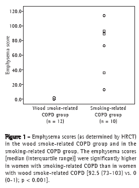 Objective: Wood smoke exposure is a risk factor for COPD. For a given degree of airway obstruction, the reduction in DLCO is smaller in individuals with wood smoke-related COPD than in those with smoking-related COPD, suggesting that there is less emphysema in the former. The objective of this study was to compare HRCT findings between women with wood smoke-related COPD and women with smoking-related COPD. Methods:áTwenty-two women with severe COPD (FEV1/FVC ratio < 70% and FEV1 < 50%) were divided into two groups: those with wood smoke-related COPD (n = 12) and those with smoking-related COPD (n = 10). The two groups were compared regarding emphysema scores and airway involvement (as determined by HRCT); and functional abnormalities-spirometry results, DLCO, alveolar volume (VA), the DLCO/VA ratio, lung volumes, and specific airway resistance (sRaw). Results: There were no significant differences between the two groups in terms of FEV1, sRaw, or lung hyperinflation. Decreases in DLCO and in the DLCO/VA ratio were greater in the smoking-related COPD group subjects, who also had higher emphysema scores, in comparison with the wood smoke-related COPD group subjects. In the wood smoke-related COPD group, HRCT scans showed no significant emphysema, the main findings being peribronchial thickening, bronchial dilation, and subsegmental atelectasis. Conclusions: Female patients with severe wood smoke-related COPD do not appear to develop emphysema, although they do show severe airway involvement. The reduction in DLCO and VA, with a normal DLCO/VA ratio, is probably due to severe bronchial obstruction and incomplete mixing of inspired gas during the determination of single-breath DLCO.