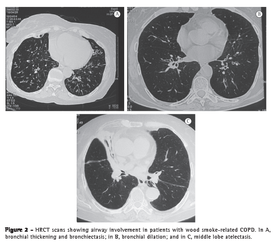 In this study based on chest HRCT findings, we demonstrated that, unlike women with smoking-related COPD, those with wood smoke-related COPD and severe obstruction do not have emphysema, although they have significant airway involvement manifesting as peribronchial thickening, bronchial dilation, and subsegmental atelectasis. These findings correlated with the fact that the change in DLCO and in the DLCO/VA ratio, as determined by pulmonary function tests, was smaller in women with wood smoke-related COPD than in those with smoking-related COPD, a finding that has been described in cases of severe small airways involvement and little emphysema.(10)