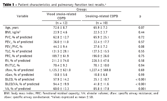 Functionally, all patients showed lung volume hyperinflation with a marked increase in functional residual capacity and residual volume, as well as a significant increase in airway resistance as measured by plethysmography, there being no differences between the two groups. Despite the same degree of obstruction, the reduction in DLCO and in the DLCO/VA ratio was significantly smaller in the wood smoke-related COPD group than in the smoking-related COPD group.