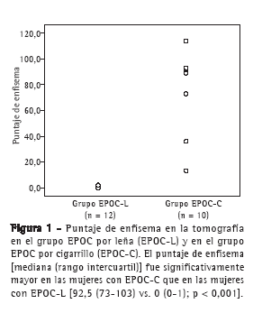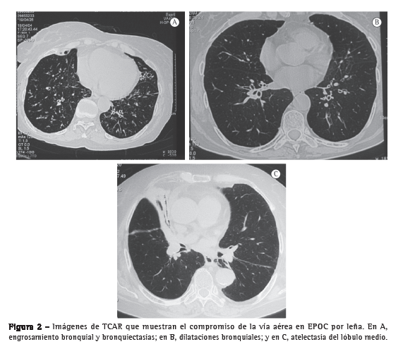 La característica funcional de limitación al flujo de aire en la EPOC es atribuida a destrucción del parénquima pulmonar con disminución del retroceso elástico y a la inflamación y obliteración de la vía aérea. Aunque no realizamos mediciones del retroceso elástico, teniendo en cuenta los hallazgos de este estudio postulamos que la disminución del flujo de aire en las pacientes con EPOC-L severa es explicada principalmente por el compromiso severo de la vía aérea y no por pérdida de retroceso elástico por enfisema. Estos hallazgos funcionales y tomográficos de ausencia de enfisema significativo se correlacionan con lo encontrado en un estudio retrospectivo de 103 autopsias de pacientes con exposición a humo de leña. Aunque en estas pacientes no se registraron datos clínicos o de función pulmonar, los hallazgos histológicos más importantes en este grupo de pacientes fueron la enfermedad vascular pulmonar hipertensiva, el depósito de pigmento antracótico peribronquial, perivascular e intersticial y la ausencia de enfisema.(30)