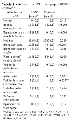 No grupo DPOC, foram encontradas associações estatisticamente significantes entre espessamento de paredes brônquicas e queixa de tosse (p = 0,013; OR = 6,13; IC95%: 1,46-25,73) e entre espessamento de paredes brônquicas e duração da exposição à fumaça de lenha em h-anos (p = 0,018; OR = 1,01; IC95%: 1,01-1,02). Houve também associações significantes entre enfisema centrolobular e duração do tabagismo passivo (p = 0,033; OR =1,08; IC95%: 1,01-1,16), e entre perfusão em mosaico e menores valores de VEF1 (p = 0,009; OR = 0,93; IC95%: 0,89-0,98).