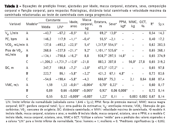 Várias variáveis cardiovasculares e ventilatórias foram determinadas no presente estudo por uma combinação de idade, sexo, estatura e massa corporal (R2 entre 0,54 e 0,65). Nossos resultados são semelhantes aos descritos por Neder et al.,(29) que relataram que várias variáveis cardiovasculares e ventilatórias podem ser determinadas pela combinação de idade, sexo, estatura e massa corporal, com um R2 entre 0,102 e 0,691.