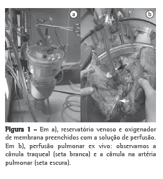 Depois desse período, iniciamos a PPEV (Figura 1). O sistema é formado por uma caixa de contenção (Vitrolife), uma bomba centrífuga (Braile Biomédica, São José do Rio Preto, Brasil), um trocador de calor (Fisics Biofísica, São Paulo, Brasil), um oxigenador de membrana (Braile Biomédica) e um reservatório venoso. Inicialmente, introduzimos uma cânula na artéria pulmonar (Vitrolife), que já tem uma pequena sonda para a conexão no transdutor de pressão, de forma que a PAP seja continuamente monitorada. O retorno da solução pelas veias pulmonares flui diretamente para a caixa de contenção, sendo drenado para o reservatório venoso por gravidade. Ao contrário do relatado em um estudo,(12) não utilizamos a canulação do átrio esquerdo em sistema fechado, deixando a técnica mais simples e eliminando a necessidade da cânula especial para o átrio utilizada por esses autores. O sistema é preenchido com 1500 mL de Steen Solution®. Optamos pelo uso da solução acelular, uma vez que a obtenção de sangue humano para estudo não é simples. Além disso, conseguimos reduzir o volume necessário de perfusato com o uso de oxigenadores, reservatórios e tubos infantis (Braile Biomédica). O pH é ajustado entre 7,35 e 7,45 pela adição de trometamol (Addex-THAM®; Fresenius-Kabi AB, Uppsala, Suécia). O fluxo que usamos para a perfusão de ambos os pulmões é de 40% do débito cardíaco (DC) estimado. Esse valor é calculado pela seguinte fórmula: DC = 3 × área de superfície corpórea.