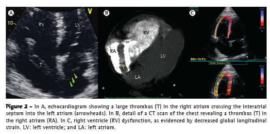 Acute pulmonary embolism (PE) is considered a cardiovascular emergency because it can lead to acute life-threatening right ventricular failure. It has been reported that approximately 5% of patients with acute PE present with right heart thrombus (RHT),(1-3) which occasionally straddles the interatrial septum, posing a threat to the pulmonary arteries and systemic circulation.