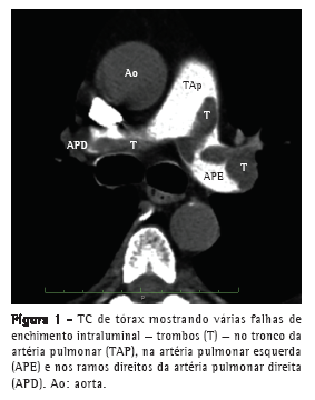 Um homem de 63 anos procurou o Hospital Pablo Tobon Uribe, em Medellín, na Colômbia, com queixa de dispneia nas duas semanas anteriores. O exame físico revelou taquicardia, taquipneia, hipertensão leve, distensão venosa jugular, distensão abdominal e edema nos membros inferiores. Entretanto, os achados cardíacos e pulmonares foram normais. O eletrocardiograma revelou apenas taquicardia sinusal. O paciente apresentou troponina I cardíaca = 0,2 ng/mL (normal: < 0,04 ng/mL) e pró-peptídeo natriurético cerebral N-terminal = 3.590 pg/mL (normal: < 125 pg/mL). A TC helicoidal de tórax realizada posteriormente confirmou a presença de EP ao revelar falhas de enchimento no tronco da artéria pulmonar e em seus ramos principais (Figura 1). A ultrassonografia venosa revelou trombose venosa profunda iliofemoral esquerda. O paciente passou então a receber heparina intravenosa.