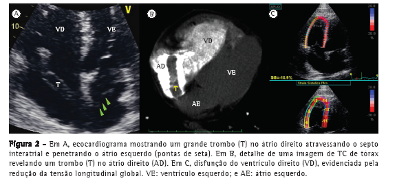 A embolia pulmonar (EP) aguda é considerada uma emergência cardiovascular porque pode levar a falência ventricular direita aguda e potencialmente fatal. Relatou-se que aproximadamente 5% dos pacientes com EP aguda apresentam trombo nas câmaras cardíacas direitas,(1-3) que ocasionalmente atravessa o septo interatrial, representando uma ameaça às artérias pulmonares e à circulação sistêmica.