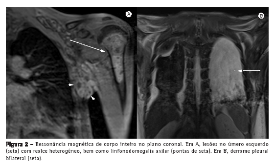 No caso apresentado aqui, a RM de corpo inteiro mostrou envolvimento em múltiplos locais em todo o corpo, incluindo o tecido subcutâneo, linfonodos, sistema esquelético, cavidade pleural, e cavidade peritoneal. Dentre as manifestações sistêmicas, concentramo-nos no extenso envolvimento torácico e esquelético. Infecções ósseas e articulares são relativamente raras em pacientes com paracoccidioidomicose. As lesões são descritas como áreas circunscritas e bem delineadas de lise, com ou sem borda de esclerose, que podem ocorrer em qualquer osso, embora tais lesões sejam geralmente vistas em clavículas, costelas e escápulas.(6)